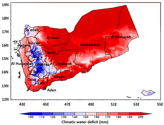 Spatial patterns of climatic water deficit (CWD) across Yemen for the period 1958–2021.