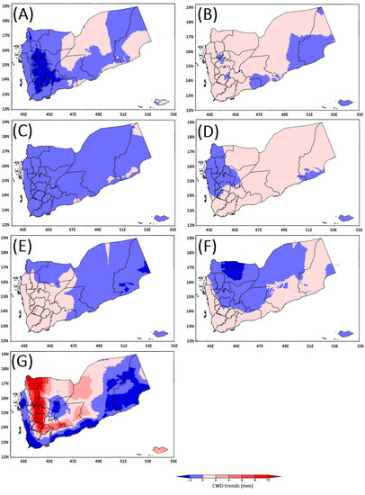 Spatial trends of climatic water deficit (CWD; mm) across Yemen: (A) 1958–1967; (B) 1968–1977; (C) 1978–1987; (D) 1988–1997; (E) 1998–2007; (F) 2008–2017; (G) 2018–2021.