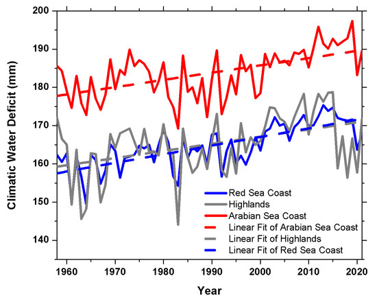 The trend of climatic water deficit (CWD) across the Red Sea coast (blue curve), the Arabian Sea coast (red curve), and the Highlands (grey curve) for the period 1958–2021. All trends are significant at α = 0.005.