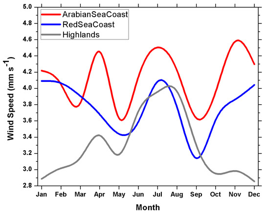 Having observed that the Arabian Sea Coast is the most water-stressed agricultural area, we examined wind speed variations across the three regions. The results indicate that with a mean monthly mean of 4.1 m s−1, the Arabian Sea coast has the highest wind speeds, while the Red Sea coast and the Highlands are roughly similar at 3.7 and 3.3 m s−1, respectively (Figure 12). Higher CWDs across the Arabian Sea Coast can, therefore, be attributed to higher wind speeds compared to other regions. When wind speed increases, it blows away atmospheric water vapor, thereby triggering a decrease in relative humidity (RH), which ultimately increases the evaporative demand.