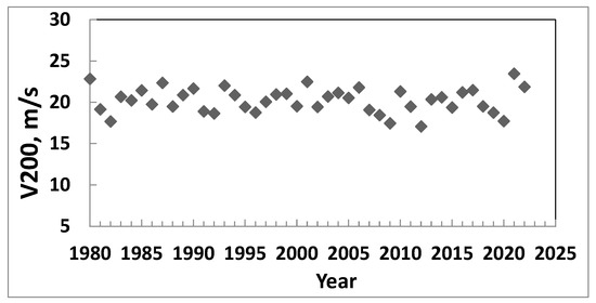 - The monthly average values of wind speed at the 200 hPa level less than 25 m/s were observed in 70% of the considered period of 1980–2022, while a V200 less than 15 m/s appeared 25% of the time. The lowest median value of V200 was 10 m/s in May. The highest median value of V200 was 31 m/s in July.