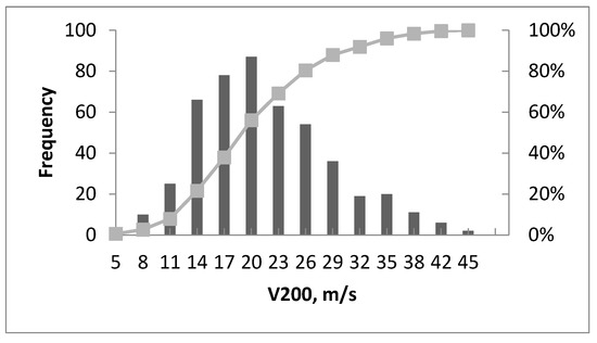 The effect of a wind-driven halo is mainly caused by the wind speeds higher than 25 m s−1 as indicated in [20]. Figure 3 shows the cumulative distribution and histogram of monthly averages values of V200.