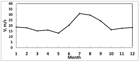 Seasonal variations in wind speed at the height of 200 hPa pressure level at the Terskol observatory: median V200 obtained from the ERA5 reanalysis data for 1980–2022.