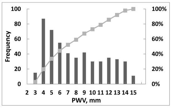 Figure 6 shows the cumulative distribution and histogram of monthly average values of PWV for the period of 1980–2022.