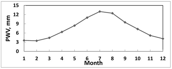 The seasonal variation of PWV is typical for middle latitudes, with higher values in summer and lower values in winter [10,14]. The median value of PWV is more 10 mm in summer, which corresponds to extremely poor IR astronomical conditions (PWV > 10 mm). The suitable conditions (3 mm < PWV < 6 mm) for IR observations are detected from November to March. The poor conditions (6 mm < PWV < 10 mm) are detected in April–May and September at the Terskol Observatory.