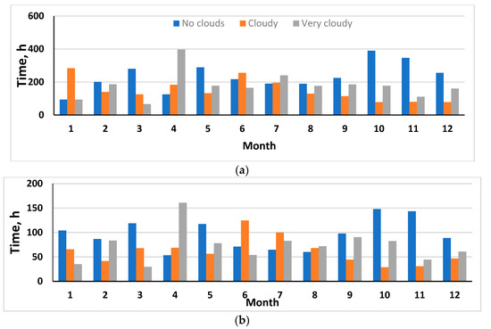 The cloudiness measurement data for 2021 at the Terskol Observatory: (a) daytime and nighttime; (b) nighttime.