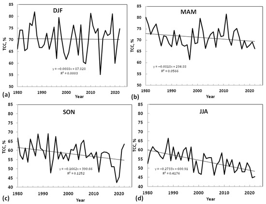 The seasonal long-term trend of TCC from 1980 to 2022 at the Terskol Observatory from ERA5 reanalysis: (a) winter (DJF); (b) spring (MAM); (c) autumn (SON); (d) summer (JJA).