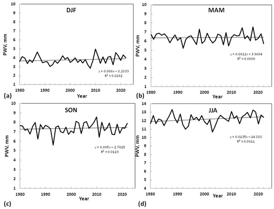The seasonal long-term trends of PWV from 1980 to 2022 at the Terskol Observatory from ERA5 reanalysis: (a) winter (DJF); (b) spring (MAM); (c) autumn (SON); (d) summer (JJA).