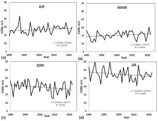 The seasonal long-term trends of V200 from 1980 to 2022 at the Terskol Observatory from ERA5 reanalysis: (a) winter (DJF); (b) spring (MAM); (c) autumn (SON); (d) summer (JJA).