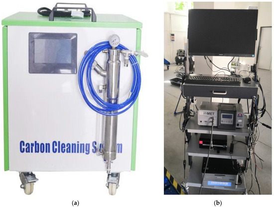 (a) Carbon Cleaner System CCS 1000 decarbonization device for ICEs; (b) emission analyzer MAHA MET 6.