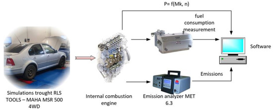 Measurements of technical parameters of the ICE were performed with a MAHA MSR 500/2 4WD dynamometer (Figure 2b). The eddy current dynamometer is equipped with an electric cylinder drive, which is realized by one electric motor on each axle. The technical data of the MAHA MSR 500/2 4WD dynamometer are listed in Table 6.