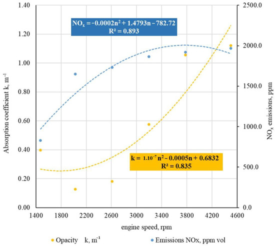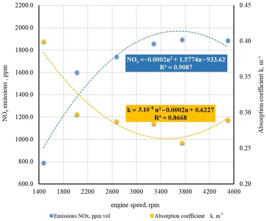 The recorded average NOx emission and absorption coefficient k values were translated by a polynomial regression function. The polynomial function of the recorded NOx emissions for the test vehicle after the decarbonization process can be expressed as: