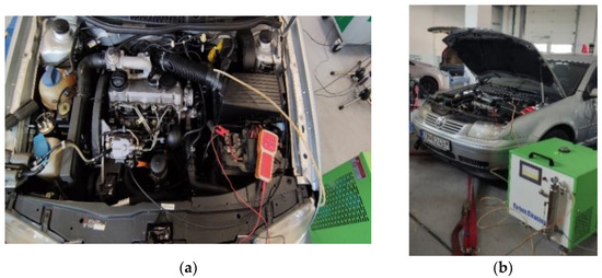 After visual inspection of the ICE and its subsequent start-up, it was necessary to connect the CCS 1000 decarbonization device to the intake system of the tested vehicle (Figure 6) via a connecting pipe and a wireless voltage sensor to the vehicle battery.