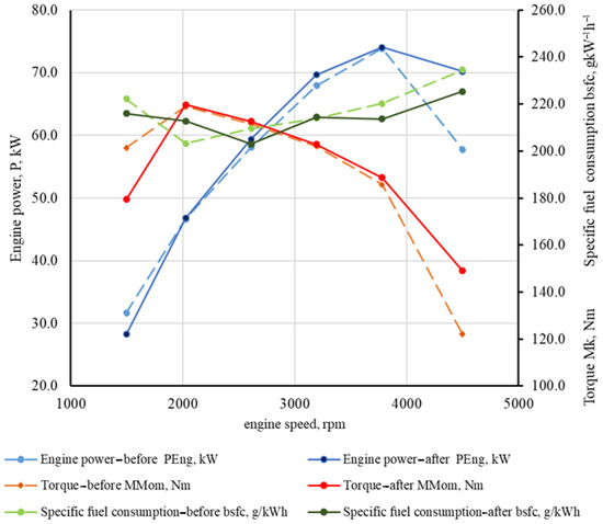 The Comparisonsof individual monitored ICE parameters before and after the decarbonization process and individual monitored emission parameters before and after the decarbonization process are shown in Figure 9 and Figure 10.