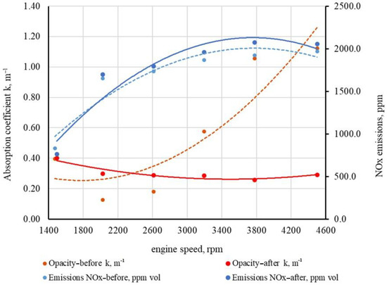 Figure 5 shows the course of NOx emissions and absorption coefficient k during the discrete load of the ICE before the decarbonization process.