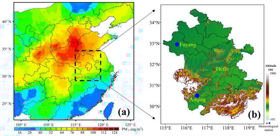 Hefei, located in east China, is a new large city with a population of 10 million and an area of 11 thousand square kilometers. This area, as shown in Figure 1a, lies in a climate transition zone with frequent heavy rainfall events. Meanwhile, it is located on the pollutant transport belt between the Jing-Jin-Ji and Yangtze River Delta areas, where air pollution often occurs in winter [43]. Air pollution in Hefei has a complex formation cause including local emissions and regional transmission [44,45,46]. Because Hefei is bordered by the Dabie Mountains to the west, the Huang Mountains to the south and plains areas to the north and east (Figure 1b), air pollutants from the north cannot export southward and accumulate around Hefei [24].
