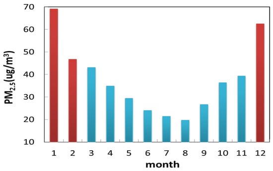 This study uses hourly concentrations of major pollutants measured on the ground in Hefei, including particulate matter (PM2.5), nitrogen dioxide (NO2), sulfur dioxide (SO2), carbon monoxide (CO) and ozone (O3), which were downloaded from the official website of the Ministry of Ecology and Environment of China. As shown in Figure 2, PM2.5 concentration has significant seasonal variation characteristics, and only the PM2.5 concentration in winter was discussed in this work, as winter had the maximum PM2.5 concentration. Meanwhile, hourly PM2.5 in precipitation periods was excluded. The hourly PM2.5 was separated into three equal groups on the basis of the lower, middle and upper terciles of normalized PM2.5. The lower and upper groupings correspond to the clean and contaminated degrees, respectively [40]. Then, clean and polluted conditions were compared to discuss the difference in vertical structure.