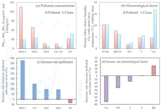 Near-surface pollutant concentration (a), meteorological factors (b) and their increase rates (c,d) in polluted and clean conditions during the winters of 2016–2021 in Hefei.