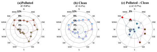 Wind direction is a useful index for judging the effect of pollution transport [24]. Figure 4 shows that the ground wind rose during the winters of 2016–2021 at Hefei station. The prevailing northerly wind dominated in winter. The most noticeable difference between the polluted and clean conditions was an increase in calm wind from 2.1% (clean) to 5.8% (polluted) (Figure 4a,b). Then, the 3.7% increment in calm wind led to more local accumulation of air pollutants (Figure 4c). Moreover, the frequency of the northwesterly (NW) and north-northwesterly (NNW) wind increased by a total of 3%, while the northeasterly wind (NE, NNE) and southwesterly wind (S, SW, WSW, W) all decreased noticeably. Considering the PM2.5 distribution around Hefei (Figure 1), the northwest upstream of Hefei was the most polluted area, and the increasing northwest wind can bring more air pollutants from the upstream region, which further increased the outbreaks of heavy air-pollution events.