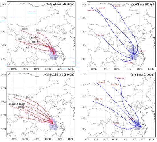 Mean HYSPLIT 72 h backward trajectories of 100 m (a,b), 500 m (c,d) and 1000 m (e,f) altitudes using cluster analysis of polluted (a,c,e) and clean (b,d,f) conditions during 2016–2021 in Hefei.