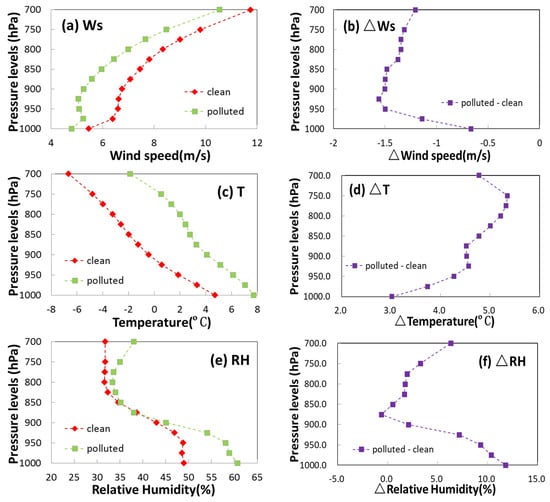 Vertical distributions of wind speed (a,b), temperature (c,d) and RH (e,f) for ‘polluted’, ‘clean’ (left) and their difference (right).