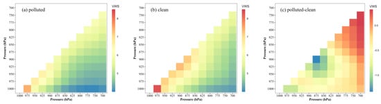 Vertical wind shear (VWS) of each height level in Hefei for (a) polluted condition, (b) clean condition and (c) their difference during 2016–2021. The X and Y represent the top and bottom height of the VWS bulk, respectively (unit: ms−1km−1).