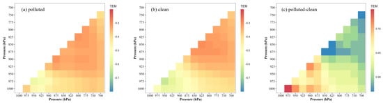 To further assess the impact of the PBL on air pollution, the vertical wind shear and temperature gradient in Hefei were calculated from 1000 to 700 hPa as shown in Figure 7 and Figure 8, respectively. The main diagonal (from top right to bottom left) shows the local VWS and temperature gradient at each pressure level, while the color shading represents the amplitude of the VWS or temperature gradient in at least two successive vertical levels. The X and Y axes represent the top and bottom heights of the VWS or gradient bulk, respectively. Normally, the VWS value is substantially lower in polluted conditions than in clean conditions, and such low VWS values can restrict mechanical turbulence, lowering vertical mixing and establishing stable structures for air pollution generation. As shown in Figure 7, the mean local VWS was 5.9 (6) ms−1km−1 and 6.5 (7.4) ms−1km−1 for the polluted (clean) conditions at the upper PBL (875–700 hPa) and lower PBL (1000–900 hPa), respectively. It is noted that the VWS difference between the polluted and clean conditions at the lower PBL was greater than that at the upper PBL. This finding implies that the vertical mixing exchanges at the lower PBL directly affect pollutant accumulation at the ground. Once stable stratification is formed within a height of 0–1 km, air quality deteriorates at the ground in Hefei. Furthermore, the mean local temperature gradient was −0.34 (−0.42) °C·100 m−1 and −0.32 (−0.52) °C 100 m−1 for the polluted (clean) conditions at the upper PBL (875–700 hPa) and lower PBL (1000–900 hPa), respectively, as shown in Figure 8. When the temperature gradient reached the lower PBL, the difference between the polluted and clean conditions was larger than that at the upper PBL. The difference tendency for temperature gradient was consistent with that of the VWS in the PBL vertical direction. Thus, the difference in temperature between the ground and 900 hPa became weaker in the polluted condition, and the stratification of the PBL became more stable. Overall, through the joint action of thermal and dynamic factors, a relatively stable level was established in the lower PBL with weaker vertical mixing and a strong relative inversion layer, which restricts pollutant uploading and promotes pollution deterioration at the ground.