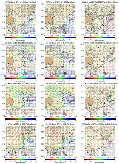 Spatial distribution of the geopotential height (black contours) superimposed by wind (color arrows, vector) at 1000 hPa (a–c), 850 hPa (d–f), 700 hPa (g–i) and 500 hPa (j–l) pressure levels under polluted (left column) and clean (middle column) conditions and the difference between them (right column) during 2016–2021. The areas highlighted with yellow lines represent the region of interest (Hefei).