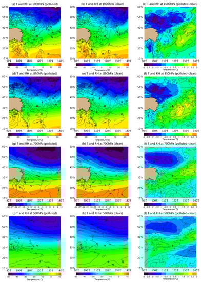 Spatial distribution of the RH (black contour) superimposed by temperature (shaded) at 1000 hPa (a–c), 850 hPa (d–f), 700 hPa (g–i) and 500 hPa (j–l) pressure levels under polluted (left column) and clean (middle column) conditions and the difference between them (right column) during 2016–2021. The areas highlighted with red lines represent the region of interest (Hefei).