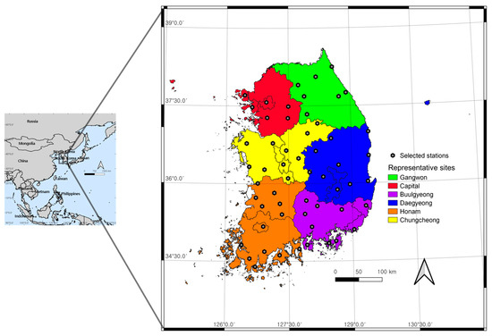 The daily precipitation data used to calculate the SPI were all obtained from the 56 sites of the Automated Surface Observation System (ASOS) operated by the South Korea Meteorological Administration (“https://data.kma.go.kr/data/grnd/selectAsosRltmList.do?pgmNo=36 (accessed on 20 July 2023)”). The data period is from January 1980 to December 2020. Figure 1 shows the locations of the observation sites, which are categorized into six regions.