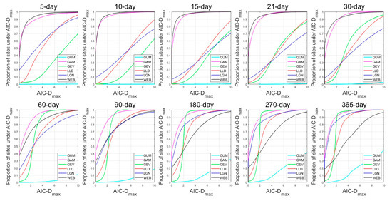AIC was used to compare the relative fit of the candidate PDFs. The of the candidate PDFs obtained from all the applied sites were aggregated. The proportion, , of sites for which each candidate PDF displays a value of below a certain was calculated. This calculation was repeated for increasing values of up to 10. Since only one candidate PDF can perform the best at each site, the sum of for all the candidate PDFs at = 0 should be one. The candidate PDF that approaches = 1 the fastest can then be considered more suitable than the others. Ideally, it is important to look at which candidate PDF has the highest -value at = 2. Figure 2 shows the of the candidate PDFs for the cumulative-precipitation time series, excluding the zero values for all seasons and all regions.