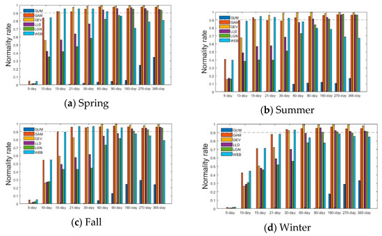 We used the Anderson–Darling test to determine if the SPI time series computed from the candidate PDFs followed a standard normal distribution. To test for normality, we calculated the proportion (i.e., normality ratio) of sites satisfying the normal distribution among all the sites for each season (see Figure 3). Wang et al. [16] assumed that if the normality ratio is greater than 90%, the time-series data of the region are normally distributed, and we also used this criterion to determine the normality of the SPI time series calculated for the corresponding time-scale.