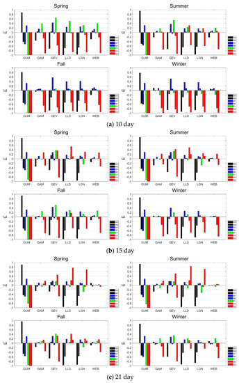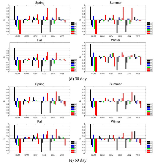 In this study, the Anderson–Darling test and a deviation from were performed to test for normality. In the Anderson–Darling test, a normality ratio of 0.9 or higher is set as the criterion for the minimum-applicable time-scale [16]. Under the premise of using the probability distribution with the best normality, from Figure 3, the minimum time-scales with a normality ratio of 0.9 or higher are 15 day, 21 day, and 30 day in the order of spring, summer, fall, and winter, which is consistent with the results in Figure 5. In addition, GAM and WEB in Figure 4b show good normality in the spring and summer. For fall and winter, we find that the error rates at 21 days and 30 days, respectively, decrease to a similar extent as the error rates in spring and summer at 15 days. When the proportion of zero values is high in a moving cumulative-precipitation time series, a significant lower bound is introduced in the SPI calculation, resulting in a truncation of the SPI distribution [7,25]. The proportion of zero values in the time series of moving accumulated precipitation over South Korea is highly seasonal, which also imposes seasonal differences on the minimum time-scale for calculating the SPI. As mentioned in Wu et al. [25], WMO [11], and Wang et al. [16], it is difficult to apply SPI with a short time-scale to the winter in South Korea, which is a period of low precipitation. Wang et al. [16] suggested that it is reasonable to apply a longer minimum time-scale in arid regions compared to humid regions. This is consistent with the longer minimum time-scale in the relatively dry Chungcheong region, a region with a high proportion of zero cumulative-precipitation values.
