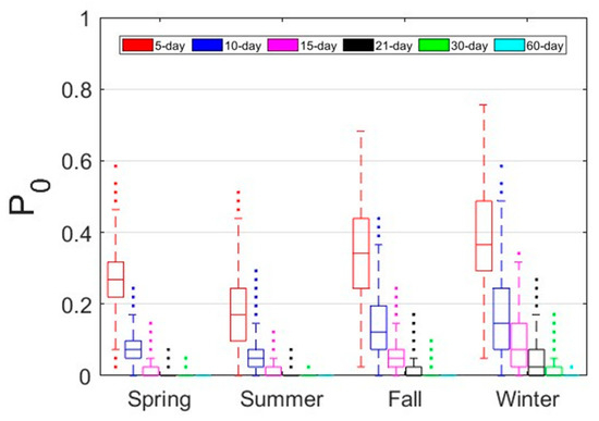 Rate of cumulative time series having zero values in all seasons for each time-scale (5 day, 10 day, 15 day, 21 day, 30 day, and 60 day) in the entire region.
