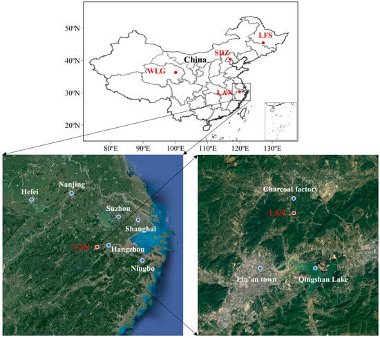 Lin’an (LAN) station (30°18′ N, 119°44′ E, 138.6 m a.s.l.), is one of the seven regional atmospheric background stations operated by the CMA and also a member station of the WMO/GAW program. The LAN station is located about 50 km west of Hangzhou (the capital city of Zhejiang Province in China) and 150 km southwest of Shanghai (Figure 1). North of the LAN station (1.4 km away) is a small factory that produces charcoal from bamboo wood. The southwest and southeast of LAN are Lin’an Town and Qingshan Lake, respectively. The observatory is on the top of a small hill with dense vegetation coverage, surrounded by hilly lands and farming areas. The station is located in the humid subtropical monsoon climate zone, with an average annual precipitation of 1480 mm and an average temperature of 15.3 °C [27]. The wind directions of the LAN station were mainly northeast and southwest accounting for 29.2% and 22.6%, respectively, and the frequency of calm wind was 4% [25].