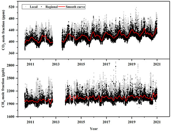 The filtered hourly CO2 and CH4 times series observed at the LAN station from 2010 to 2020. The grey points denote locally influenced data and the black points denote regionally representative data. The red lines are the smooth curves of the regional data obtained by the curve-fitting program [34]. There are data gaps caused by the malfunction of the instrument from 1 October 2012 to 26 June 2013 for CO2 and from 1 October 2012 to 3 October 2013 for CH4.