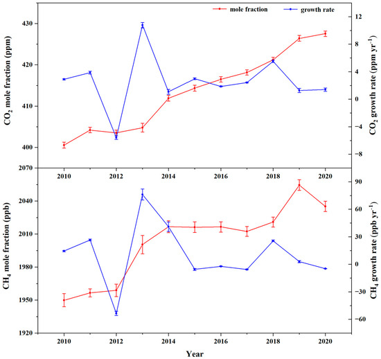 The yearly average CO2 and CH4 mole fractions and growth rates at the LAN station from 2010 to 2020. Error bars indicate 95% confidence intervals.