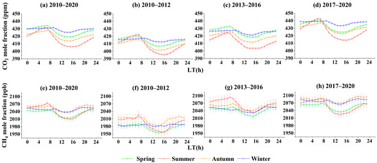 Diurnal CO2 and CH4 cycles from 2010 to 2020 at the LAN station. The top and bottom panels show the diurnal cycles of CO2 (a–d) and CH4 (e–h) in different periods, i.e., 2010–2020 (a,e), 2010–2012 (b,f), 2013–2016 (c,g), 2017–2020 (d,h), respectively. Different colored lines represent different seasons. The error bars represent 95% confidence intervals.