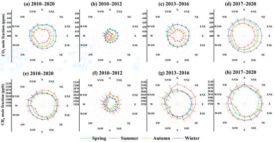 The wind rose distributions of average CO2 and CH4 mole fractions in the 16 sectors from 2010 to 2020 at the LAN station. The top and bottom panels show the wind rose distributions of CO2 (a–d) and CH4 (e–h) in different periods, i.e., 2010–2020 (a,e), 2010–2012 (b,f), 2013–2016 (c,g), 2017–2020 (d,h), respectively. The different colors represent the CO2 and CH4 data for different seasons. The error bars represent 95% confidence intervals.