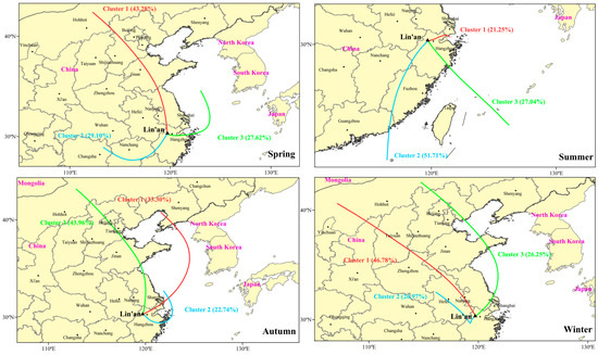 To investigate the contribution of long-range transport, we used the Hybrid Single-Particle Lagrangian Integrated Trajectory (HYSPLIT) to calculate a 72 h back trajectory consistent with the time of the observed regional CO2 and CH4 events. We used the back trajectories in January, April, July, and October, respectively, to represent winter, spring, summer, and autumn. Figure 6 and Table 1 showed the results of back trajectory cluster analysis for the four seasons from 2010 to 2020, as well as the average CO2 and CH4 mole fractions on each cluster.