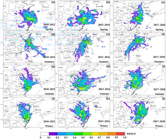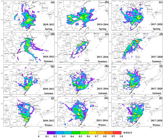 The geographical distribution of CO2 weighted potential sources in different periods from 2010 to 2020 at the LAN station. The gradient colors represent the intensity of potential source regions in different seasons, i.e., spring (a–c), summer (d–f), autumn (g–i), and winter (j–l) and different periods, i.e., 2010–2012 (a,d,g,j), 2013–2016 (b,e,h,k), and 2017–2020 (c,f,i,l).