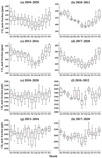 Monthly variations in regional CO2 and CH4 mole fractions from 2010 to 2020 at LAN. The top and bottom panels show the monthly variations of CO2 (a–d) and CH4 (e–h) in different periods, i.e., 2010–2020 (a,e), 2010–2012 (b,f), 2013–2016 (c,g), 2017–2020 (d,h), respectively. The top and bottom edges of the box describe the 25th, median, and 75th percentiles from bottom to top. The bottom and the top reach the minimum and 1.5 times interquartile range (IQR). The black dots represent outliers. The red dots represent averages.