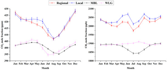 Seasonal variations of regional and local CO2 and CH4 mole fractions at LAN (2010–2020). Compared also with the results at Mt. Waliguan (WLG; 2010–2019) and Marine Boundary Layer reference (MBL; 2010–2019) surface values (30° N) computed from NOAA/ESRL. Error bars indicate standard deviations with confidence intervals of 95%.