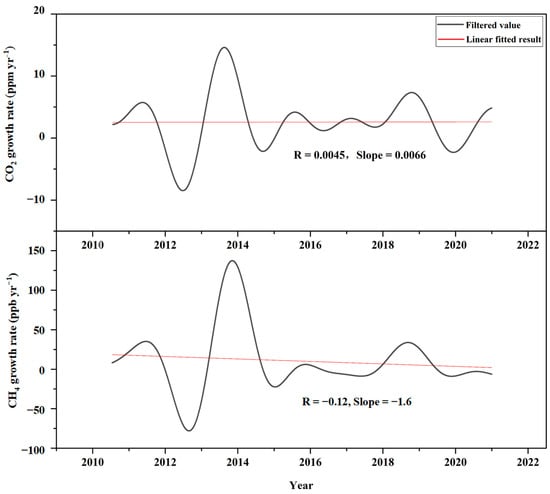 The annual growth rates of the atmospheric CO2 and CH4 from 2010 to 2020 at the LAN station. The black line represents the filtered value, which was calculated from the first derivative of the trend curves. The red line represents the slope, which was calculated by linear regression.