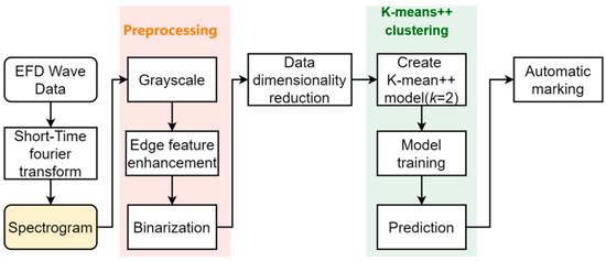 Flow chart of automatic recognition algorithm of VLPT. Among them, the yellow box represents the object handled in this article, the red box indicates the preprocessing process for the spectrogram, and the green box represents the workflow for unsupervised clustering.