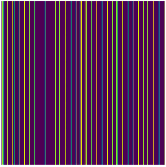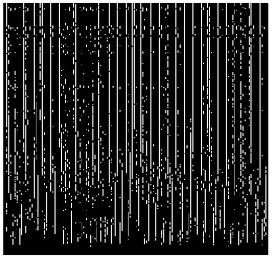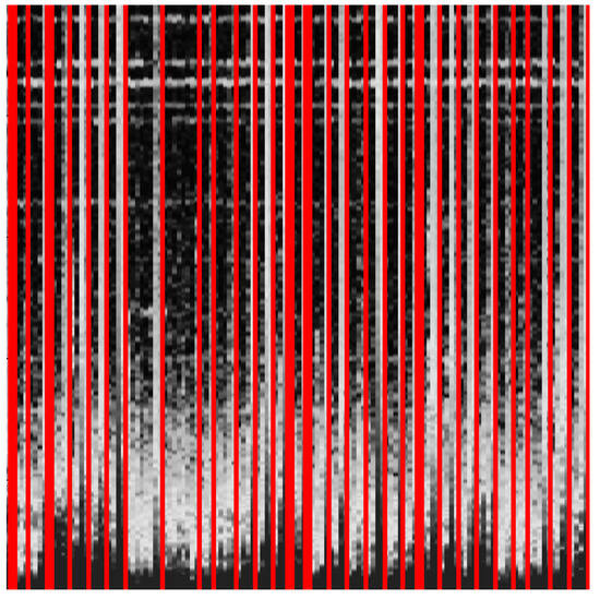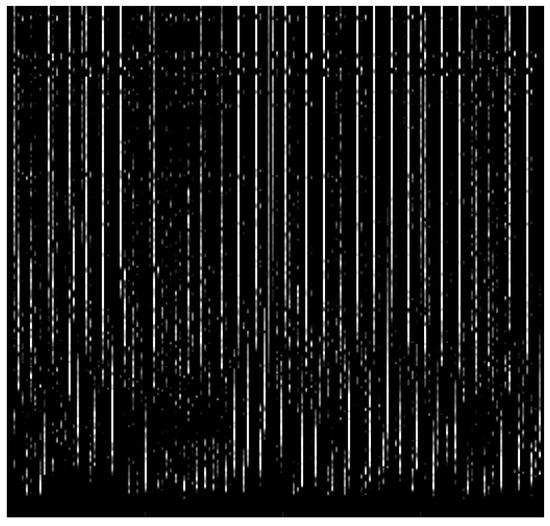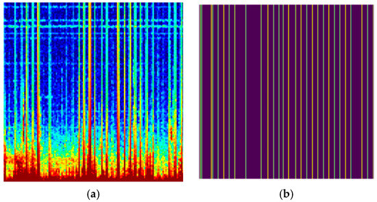 A K-means++ model is established with K = 2. A spectrogram with clear and abundant vertical lines, such as shown in Figure 10a, is selected. After the aforementioned preprocessing steps, each column of pixels is treated as a sample vector and undergoes dimensionality reduction. These vectors are then fed into the model for training. By accessing the label attribute of the K-means++ model, the clustering labels of each column vector sample can be obtained. The labels representing the vertical lines are visualized in Figure 10b.