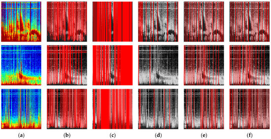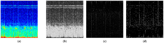 For each track dataset, multiple spectrograms with a duration of 8 s were generated. The following preprocessing steps were applied to each spectrogram: grayscale conversion, edge feature enhancement, and binarization. Taking a spectrogram (denoted Figure 9a) with fewer vertical lines as an example, the results of each preprocessing step are shown in Figure 9b–d.