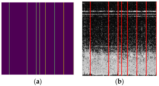Spectrograms of training samples. (a) A spectrogram which can be used as training samples after preprocessing; (b) visualization of the labels representing the vertical lines in the samples.
