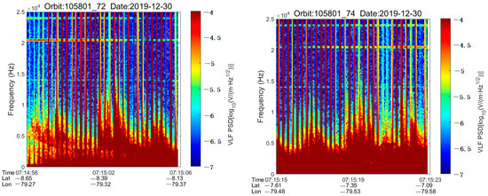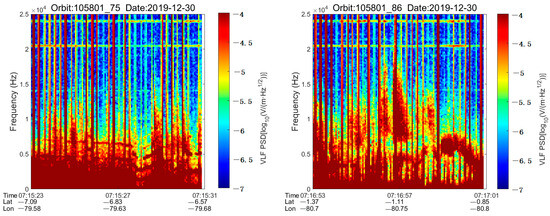 Two spectrograms with a duration of 8 s. (a) The 103rd spectrogram of orbit number 109601; (b) the 15th spectrogram of orbit number 109621.