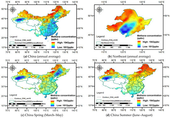 There is significant seasonal variation in methane concentrations in the near-surface troposphere of China. In spring, the near-surface tropospheric methane concentration is mainly concentrated in the Northeast China high-latitude permafrost zone, southwest Sichuan, and northern Xinjiang, while the methane concentration in the Northeast China plain and the Qinghai–Tibet Plateau is relatively low. In summer, the near-surface tropospheric methane concentrations are relatively high at mid-to-high latitudes, with only relatively low methane concentrations in the northwest Qinghai–Tibet Plateau and southern China. In autumn, the near-surface tropospheric methane concentration in South China is higher than that in North China, and the methane concentration in Southwest China is the highest. In winter, the near-surface tropospheric methane concentration is generally low, with high values mainly concentrated in the permafrost area of Northeast China, as shown in Figure 4 (850 hPa); Supplementary Materials: Figure S1 (400 hPa) and Figure S2 (600 hPa)).